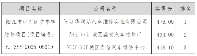 我院按程序对阳江市中医医院车辆维修项目进行院内遴选采购,于2025年9月9日组织5名评委进行了评审,此次遴选共有3家公司按要求递交了响应文件。经过评选委员会对各响应文件进行评审,最终排名如下: