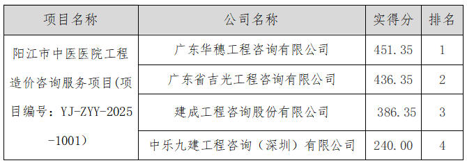 我院按程序对阳江市中医医院工程造价咨询服务项目进行院内遴选采购,于2025年12月18日组织5名评委进行了评审,此次遴选共有4家公司按要求递交了响应文件。经过评选委员会对各响应文件进行评审,最终排名如下: