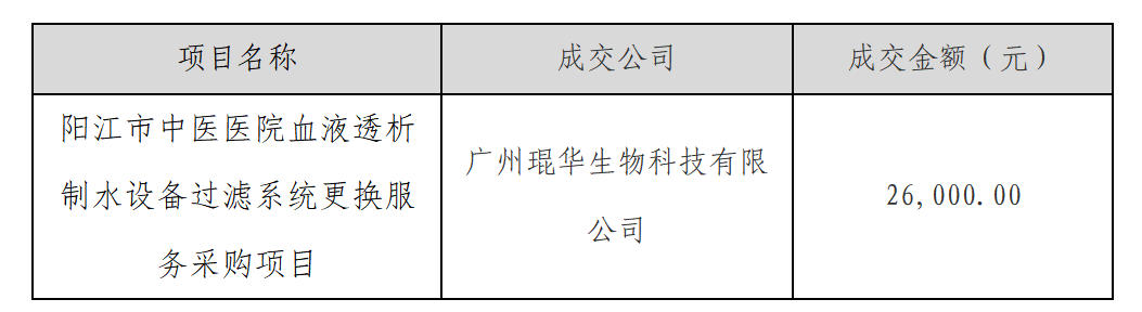 阳江市中医医院血液透析制水设备过滤系统更换服务采购项目采购结果公示