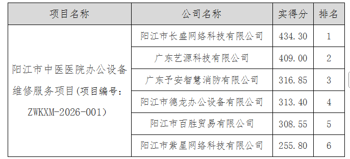我院按程序对阳江市中医医院办公设备维修服务项目进行院内遴选采购,于2026年3月9日组织5名评委进行了评审,此次遴选共有6家公司按要求递交了响应文件。经过评选委员会对各响应文件进行评审,最终排名如下: